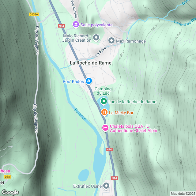 À 10 km au Nord de Mont-Dauphin sur la N94, à Droite. Bon camping et restaurant au bord du lac.