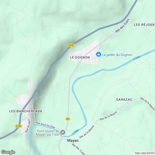 Prenez à l’Est sur la D4 (Mayac), traversez le 1er pont après 1,5 km, puis continuez 1,6 km pour la piste sur la Droite.